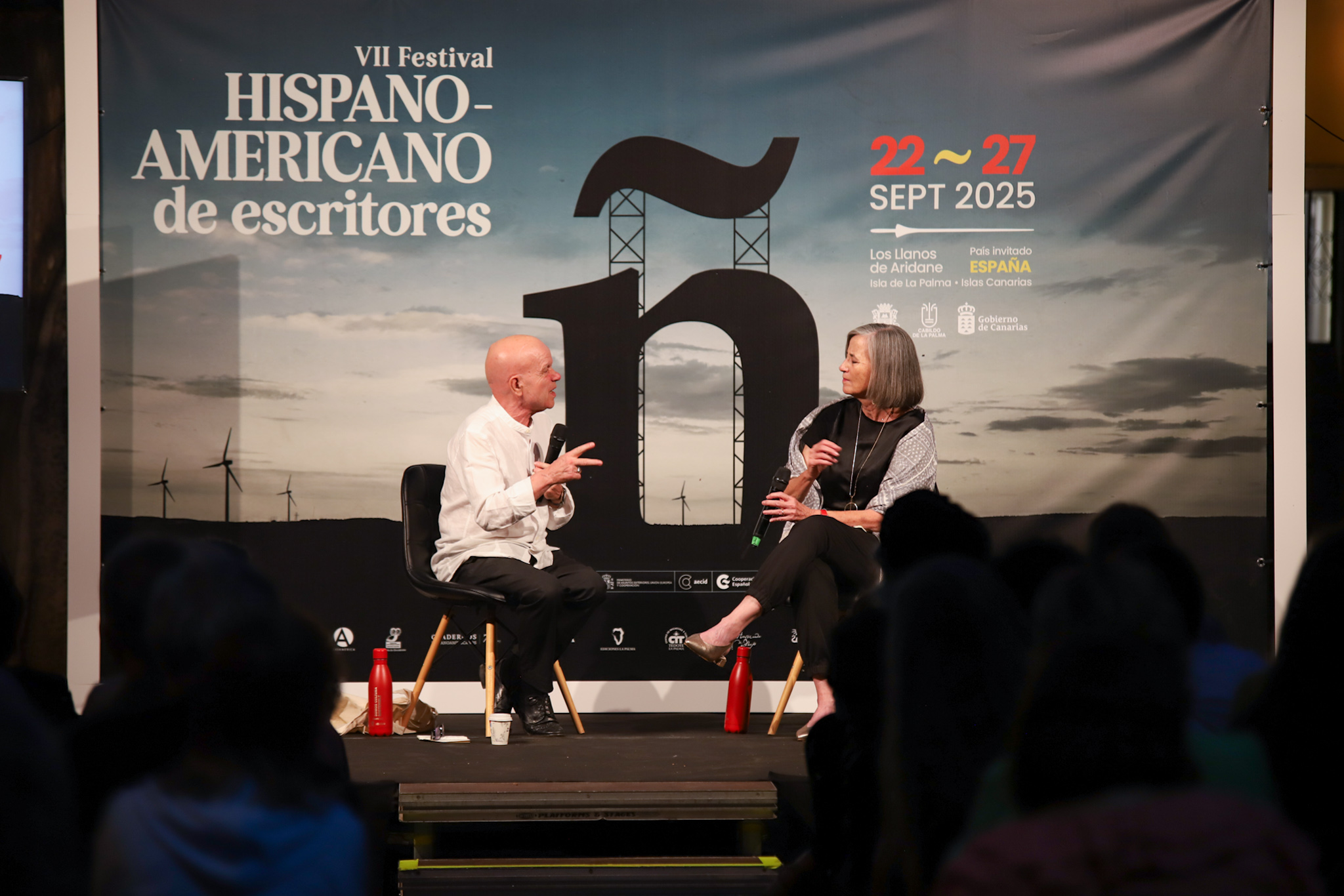 El arranque del festival continuó con la conversación entre el novelista español Jesús Ferrero y la escritora mexicana Mónica Lavín acerca de la novela de Malcolm Lowry titulada "Bajo el volcán", en un encuentro que unió la fuerza creativa con el espíritu de La Palma.