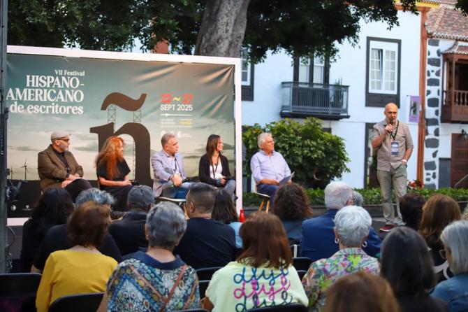 La experiencia vivida por los autores ha sido el eje de la conversación celebrada en la plaza de España de Los Llanos de Aridane, en la que los escritores reflexionaron sobre la conexión entre literatura y astronomía, y cómo ambas disciplinas comparten la capacidad de generar asombro, preguntas y relatos sobre nuestro lugar en el universo.
