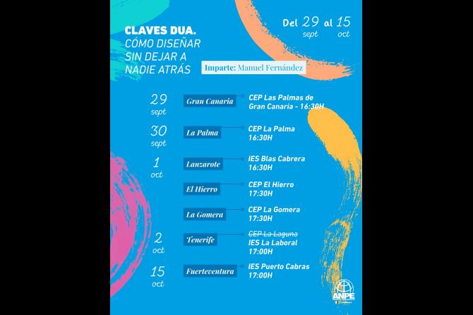 Las charlas arrancarán el próximo lunes, 29 de septiembre, a las 16:30 horas en el CEP Las Palmas de Gran Canaria, para a continuación trasladarse a La Palma (martes 30 de septiembre a las 16:30 en el CEP La Palma), Lanzarote (miércoles 1 de octubre a las 16:30 horas en el IES Blas Cabrera Felipe), El Hierro (miércoles 1 de octubre a las 17:30 horas en el CEP El Hierro), La Gomera (miércoles 1 de octubre a las 17:30 horas en el CEP La Gomera), Tenerife (jueves 2 de octubre a las 17:00 horas en el IES La Laboral), y finalmente, Fuerteventura (miércoles 15 de octubre a las 17:00 horas en el IES Puerto Cabras Rafael Báez).