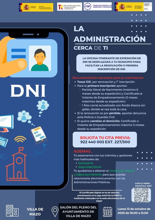 El Ayuntamiento de Villa de Mazo pone en marcha el proyecto La Administración Cerca de Ti, a través del cual la oficina itinerante de expedición de DNI se desplaza al municipio el próximo lunes, 13 de octubre, de 10:00 a 13:00 horas. El principal objetivo de esta iniciativa es facilitar la renovación o primera inscripción del DNI, además de la expedición de certificados digitales y cl@ves permanentes. Tendrá lugar en el Salón de Plenos del Ayuntamiento.