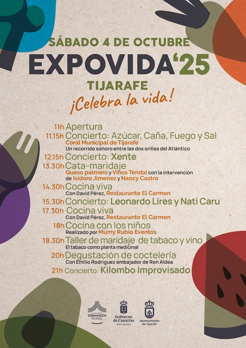 Tras la apertura, la Coral Municipal de Tijarafe será el encargada de poner la nota musical con el concierto “Azúcar, caña, fuego y sal” hasta las 12:15 horas. Tras ella, Xente amenizará la jornada hasta las 13:30 horas, momento en el que comenzará una cata-maridaje de queso palmero y vinos Tendal, con la intervención de Isidoro Jiménez y Nancy Castro. A las 14:30 horas tendrá lugar la primera sesión de “Cocina viva”, a cargo de David Pérez de Restaurante Carmen. Para continuar, a las 15:30 horas, con el concierto de Leonardo Lires y Nati Caru. A partir de las 18:00 horas se celebrará la segunda sesión de “Cocina viva” con David Pérez.