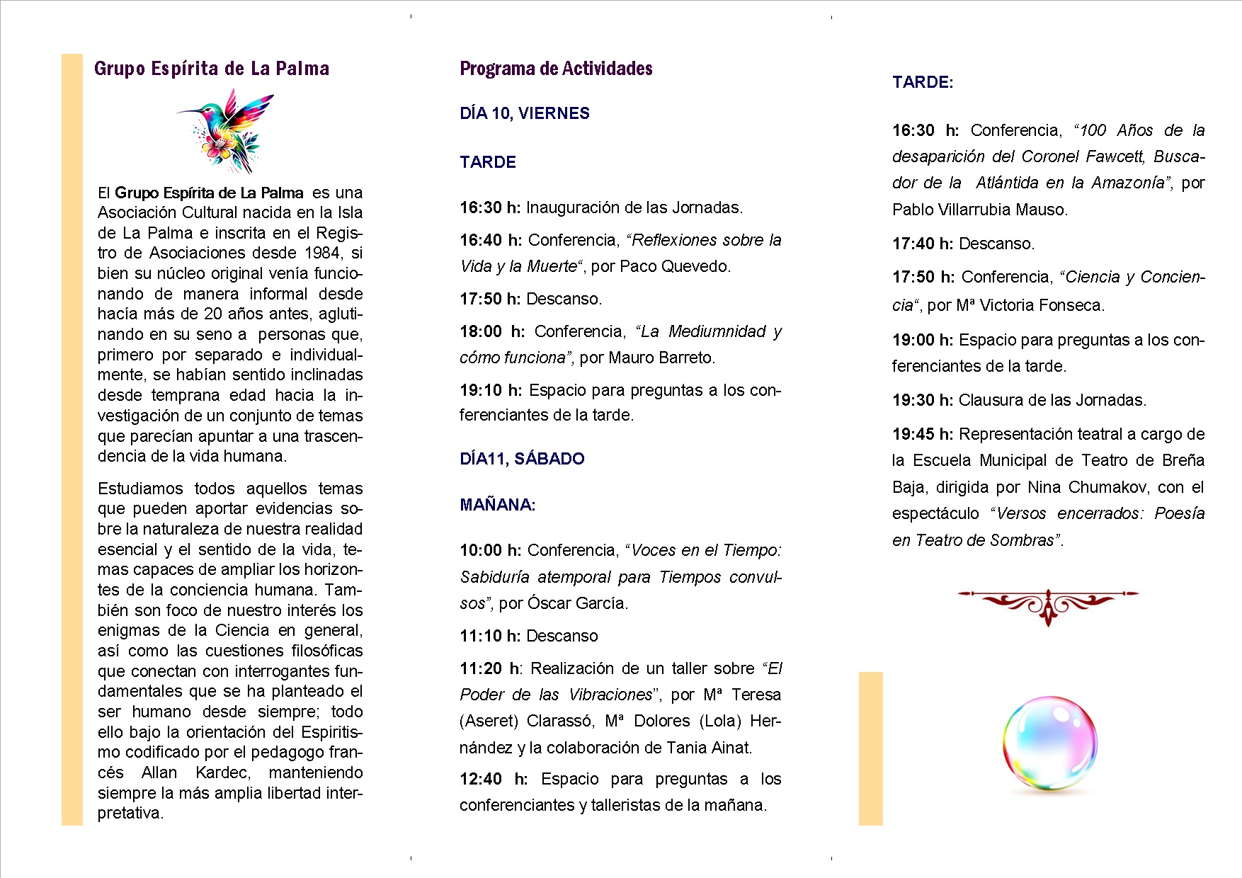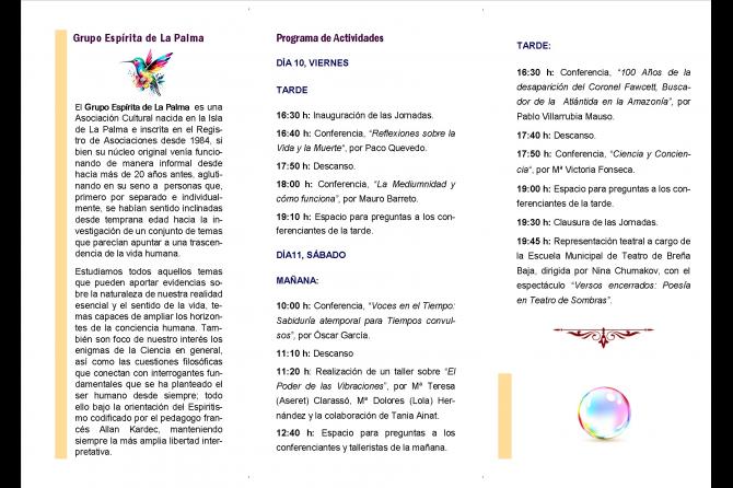 - Por último, en cuanto a orden de aparición pero no de importancia, se cuenta para esta edición con la especial colaboración de la Escuela Municipal de Teatro de Breña Baja, dirigida por Nina Chumakov, de cuyo elenco forma parte la auxiliar de clínica y actriz aficionada Charo Carrascoso, compañera del Grupo Espírita de La Palma, quienes a partir de las 19:45 horas del sábado 11, cerrarán las Jornadas con la representación del espectáculo “Versos Encerrados, Poesía en Teatro de Sombras”.