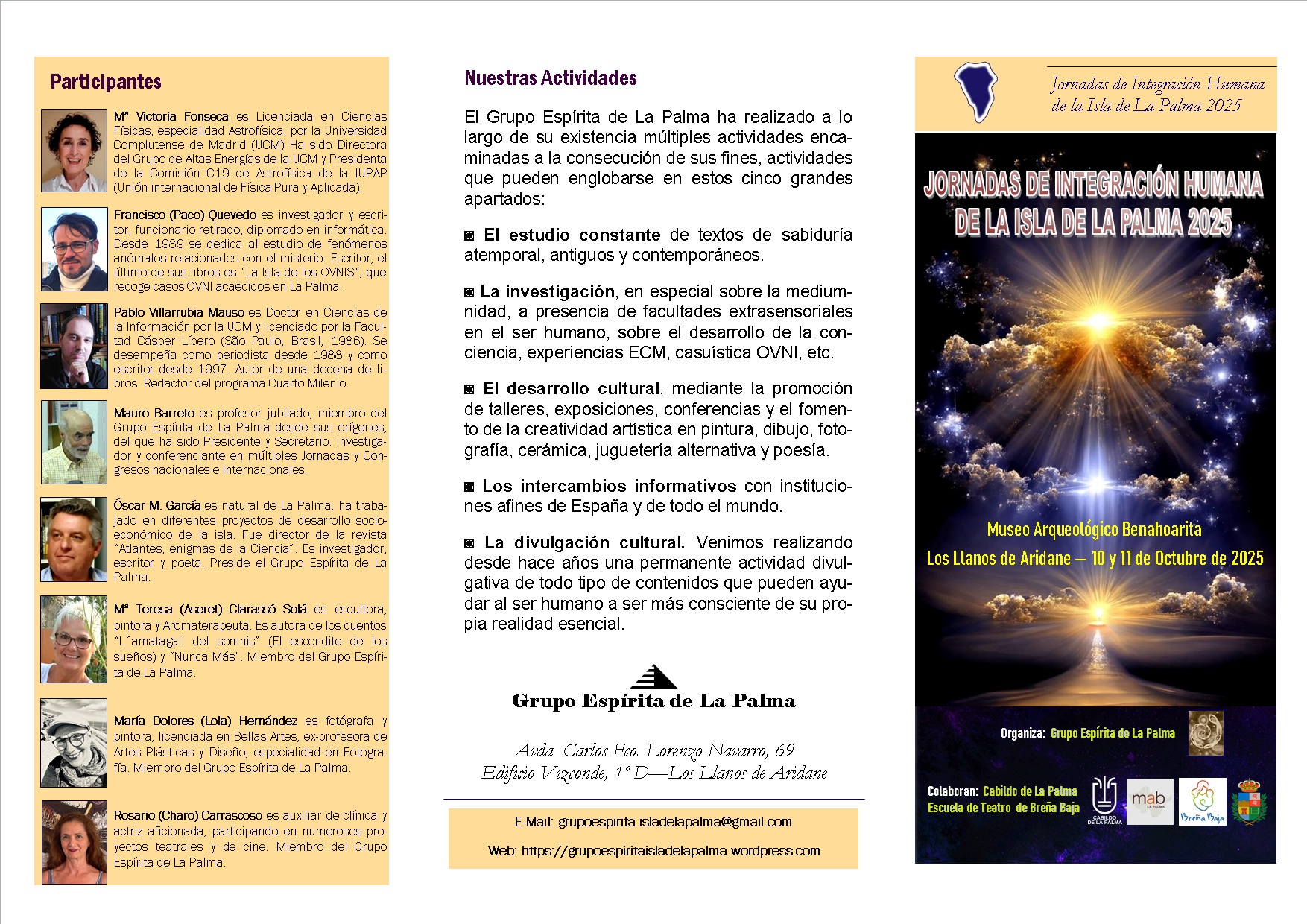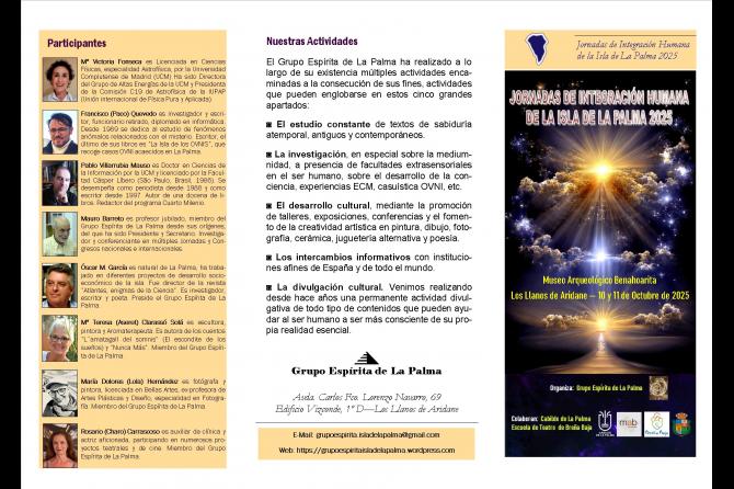 - Intervendrán, además, en las Jornadas varios miembros del Grupo Espírita de La Palma, empezando por el investigador, historiador, escritor y poeta, Óscar García Rodríguez, presidente de la Asociación organizadora, autor de las obras “Historia del Espiritismo en la Islas Canarias”, “Bibliografía Espiritista Española: 1857-1936”, y de los poemarios “Páginas Interiores” y “Recuentos de Luz entre Ausencias” (ambos inéditos), quien a partir de las 10:00 horas de la mañana del sábado, día 11, impartirá la conferencia “Sabiduría Atemporal para Tiempos convulsos”.