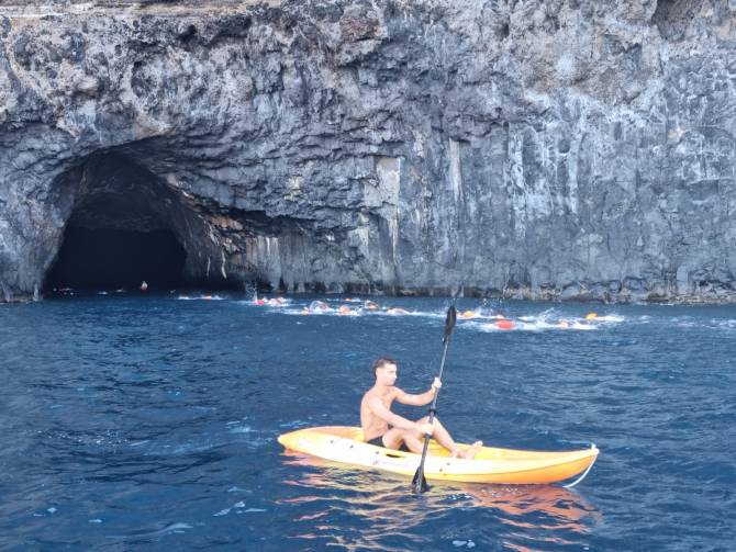 La prueba comenzó en la costa de Tijarafe donde su alcaldesa Yaiza Cáceres tuvo la oportunidad de disfrutar con la salida de la prueba de 6,5 kilómetros, prueba que partió desde el Porís hacia la Cueva Bonita, donde los nadadores y nadadoras entraron por una de sus aperturas, para continuar por la boca sur hacia el Puerto de Tazacorte, donde esperaban tanto Raquel Rebollo, Consejera de Turismo del Cabildo de La Palma como el concejal de Deportes del Ayuntamiento de Tazacorte Toni Santana.
