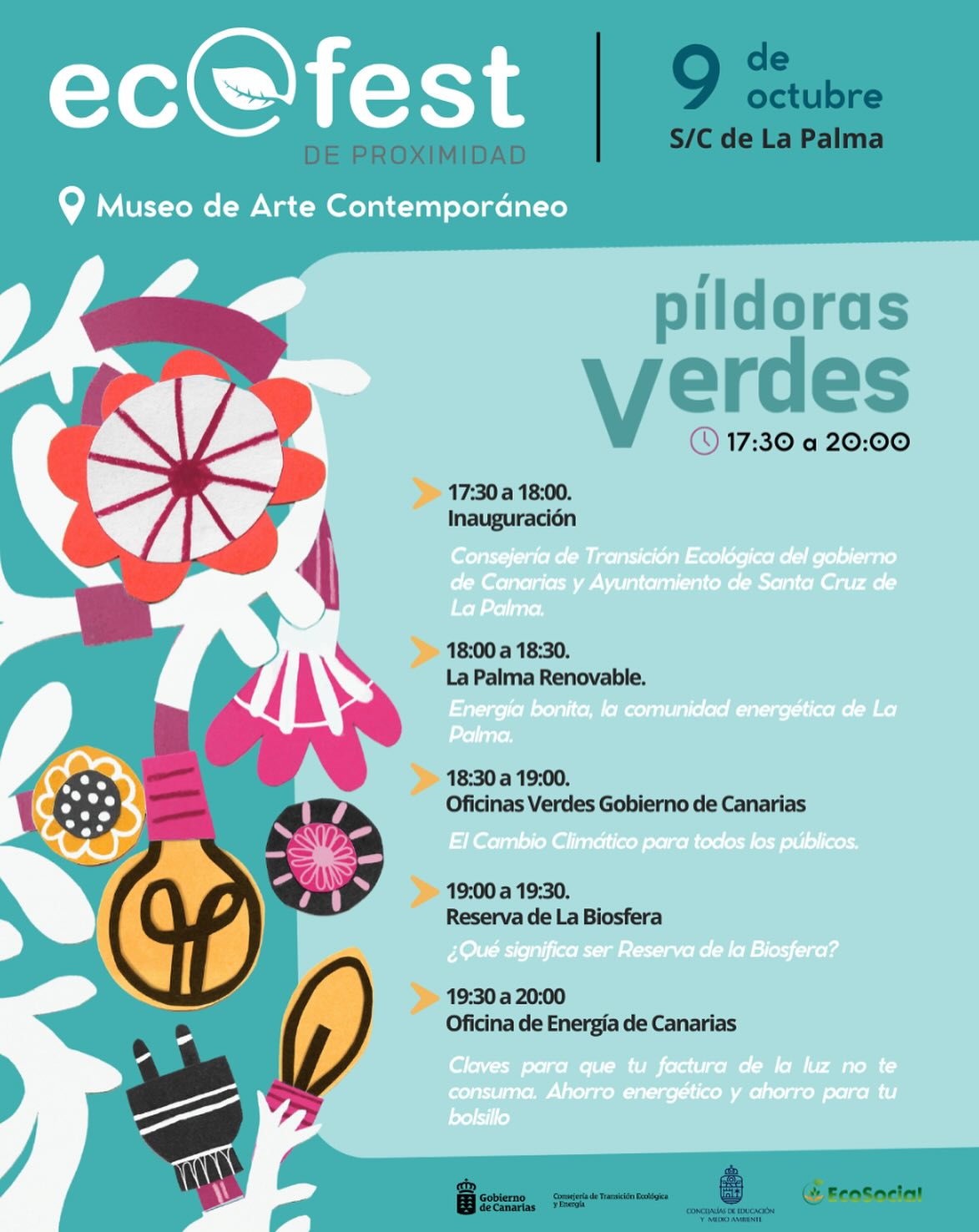 Dentro de la programación del festival, organizado por Ecosocial Canarias e impulsado por la Consejería de Transición, junto con la concejalía de Educación y Medio Ambiente del Ayuntamiento de Santa Cruz de La Palma, las Oficinas de Energía de Canarias y las Oficinas Verdes de Canarias contarán con un estand informativo propio para atender a la ciudadanía y participarán en la sesión “Píldoras verdes” con charlas divulgativas en torno a la eficiencia energética, la educación ambiental y el cambio climático.