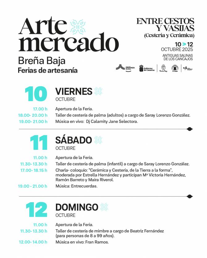 - 17 h: Charla Coloquio: “Cerámica y Cestería, de la tierra a la forma”, moderada por Estrella Hernández y participan M.ª Victoria Hernández, Ramón Barreto y Maira Riverol.
