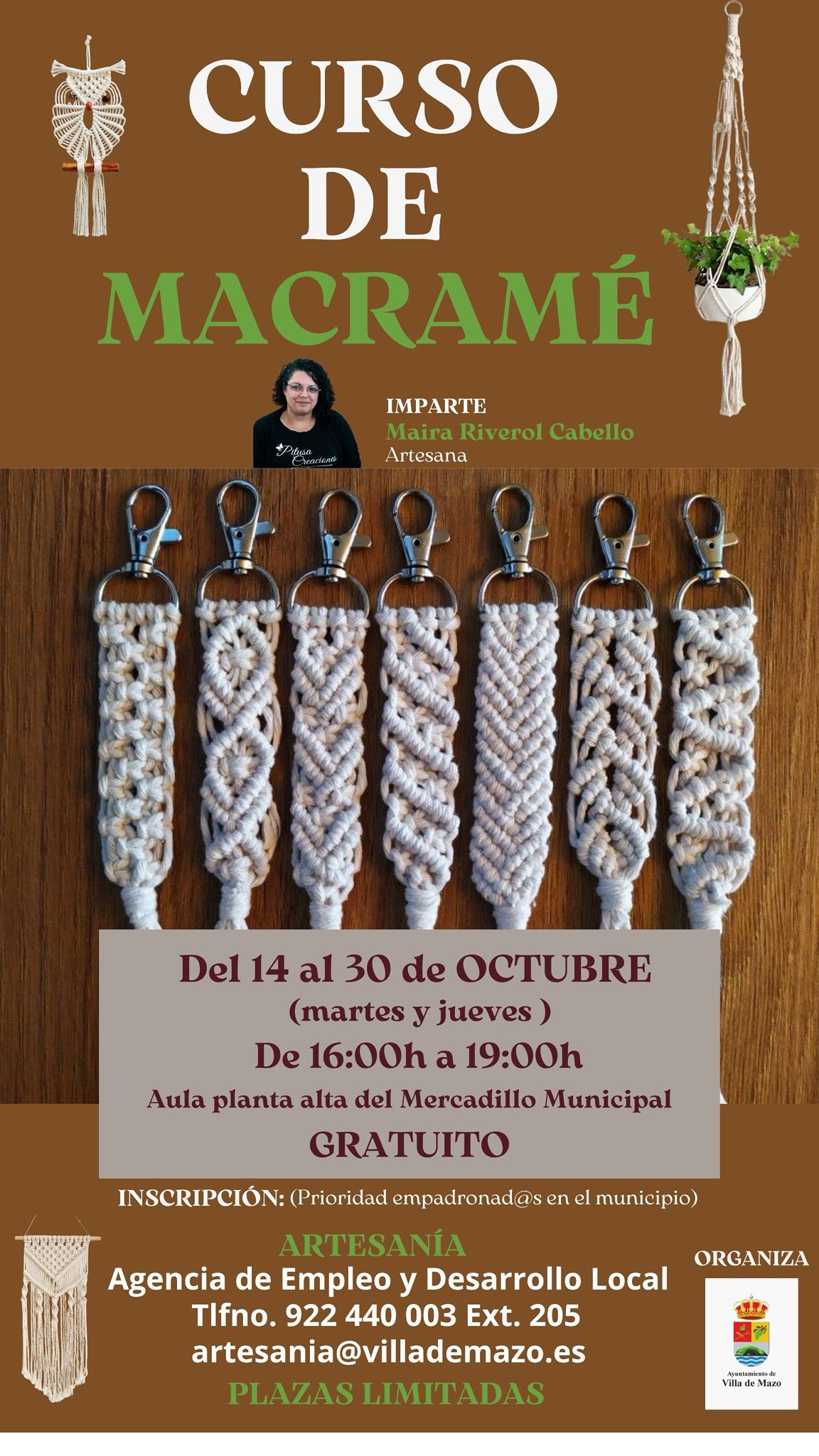 El Ayuntamiento de Villa de Mazo continúa impulsando los oficios tradicionales con un curso de macramé impartido por la artesana Maira Riverol. La formación se ofrecerá los martes y jueves, desde el 14 al 30 de octubre, en horario de 16:00 a 19:00 horas, en el aula de la parte alta del Mercadillo Municipal.