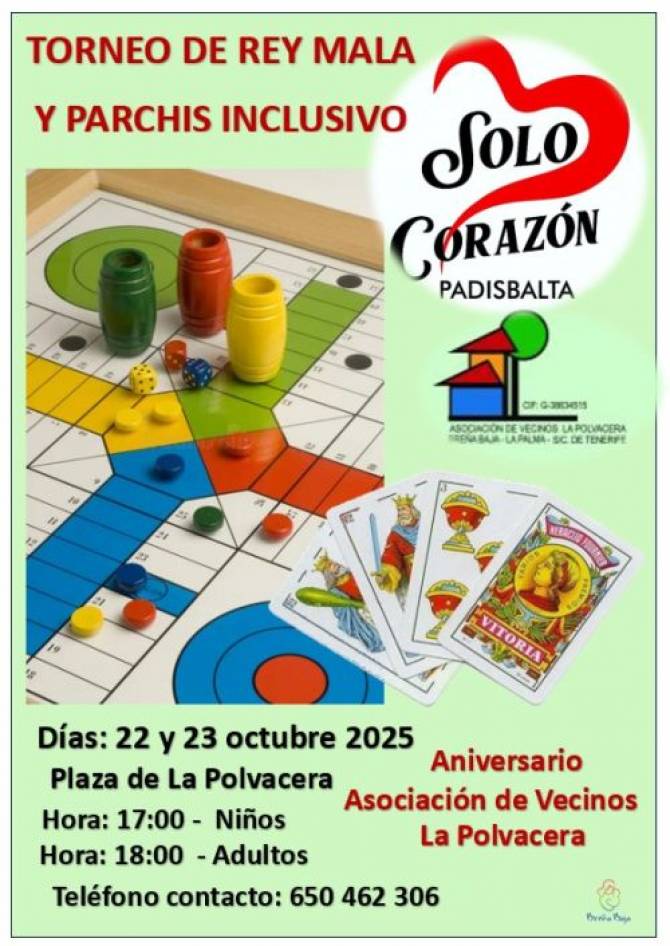 La Asociación de Padres y Familiares de personas con discapacidad “Padisbalta” organiza los días miércoles 22 y jueves 23 de octubre torneos inclusivos de Rey Mala y Parchis en la Plaza de La Polvacera con motivo del 25º Aniversario de la Asociación de Vecinos de “La Polvacera”. Se cuenta también con la colaboración del Ayuntamiento de Breña Baja.