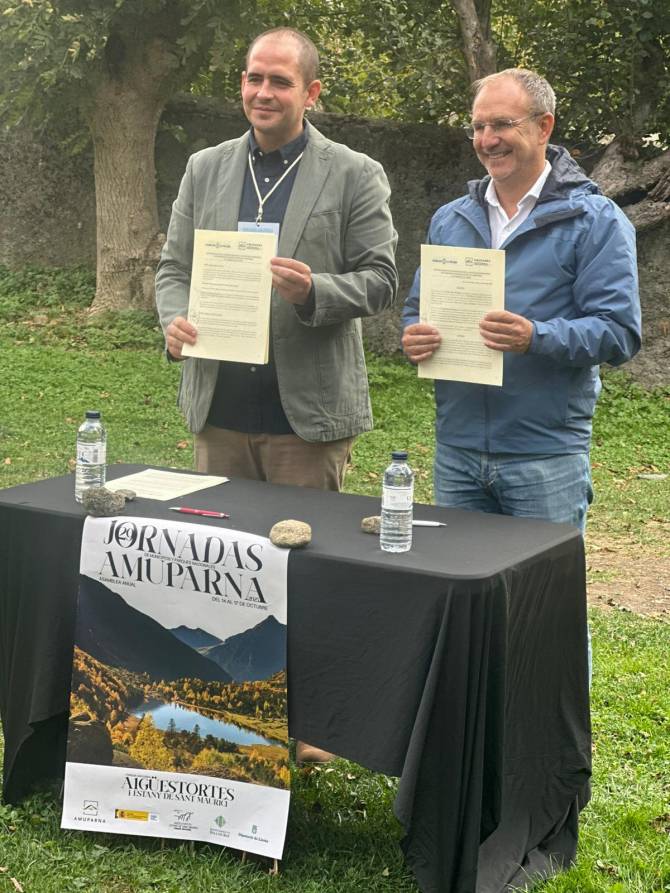 El presidente del Cabildo de La Palma, Sergio Rodríguez, y el presidente de la Asociación de Municipios con Territorio en Parques Nacionales (Amuparna), Ángel Pérez, han suscrito el convenio que permite a ambas entidades fortalecer la cooperación institucional y promover acciones conjuntas orientadas al desarrollo socioeconómico de los parques nacionales y sus áreas de influencia.