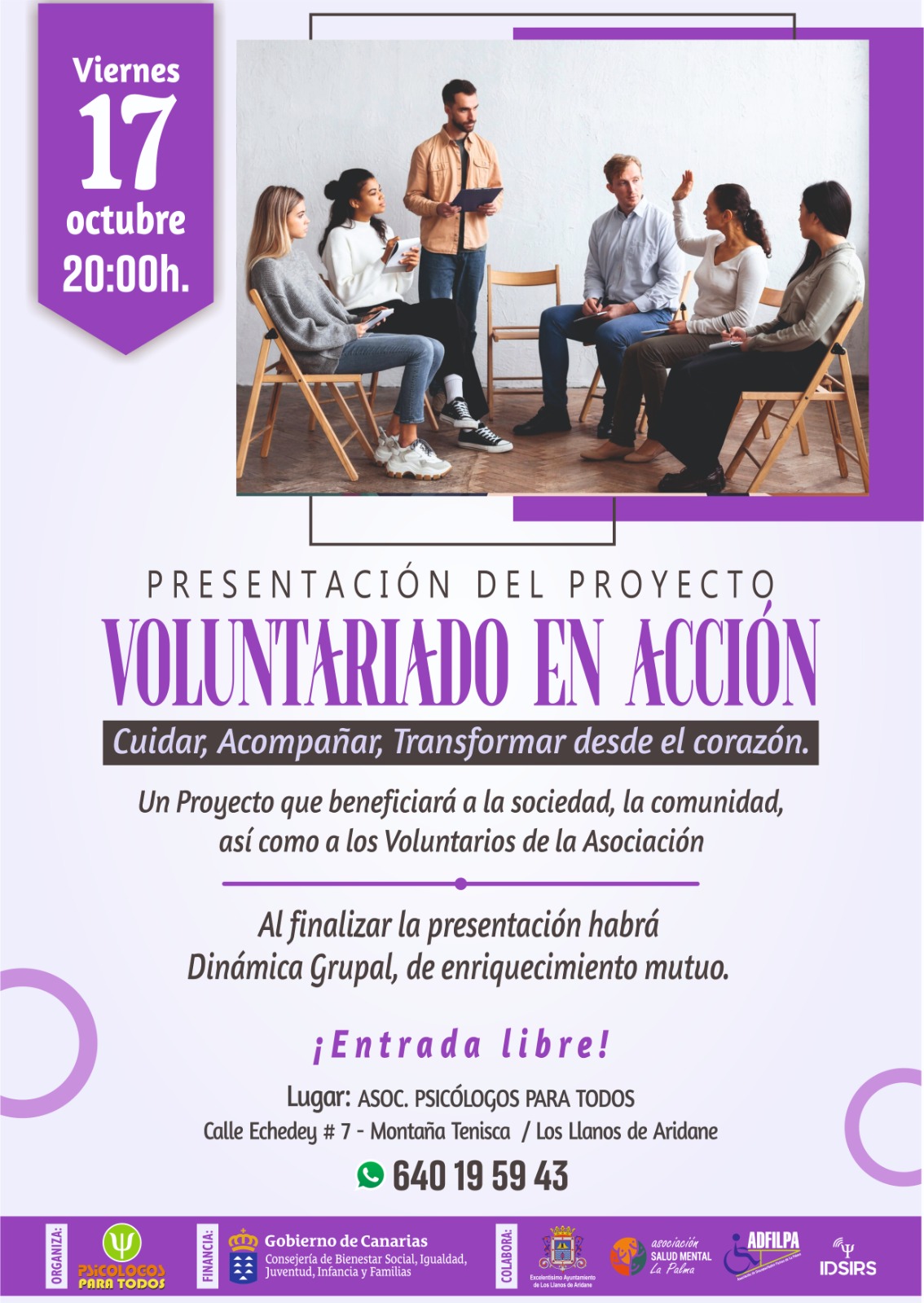 La asociación Psicólogos para Tod@s presentará este viernes el proyecto ‘Voluntariado en Acción: cuidar, acompañar y transformar desde el corazón’. Una iniciativa que, con financiación de la Consejería de Bienestar Social, Igualdad, Juventud, Infancia y Familias del Gobierno de Canarias, pretende favorecer “la salud emocional y social de las personas más vulnerables de la isla de La Palma”, indica la entidad en un comunicado.