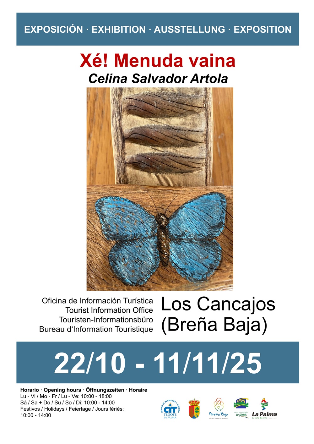 Del 22 de octubre al 11 de noviembre Celina Salvador Artola nos muestra sus obras “Xé! Menuda vaina” en la Oficina de Turismo de Los Cancajos y en los horarios habituales de la oficina. Colabora Ayuntamiento de Breña Baja y CIT Tedote, entre otros.