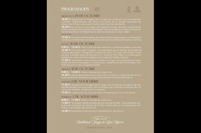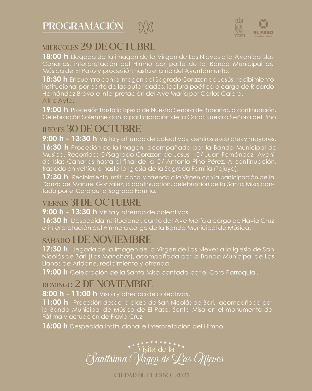 El programa de actos en formato físico está disponible en el Ayuntamiento de El Paso, Casa de la Cultura ‘Braulio Martín Hernández’, Oficina de Información Turística e Iglesia de Nuestra Señora de Bonanza.