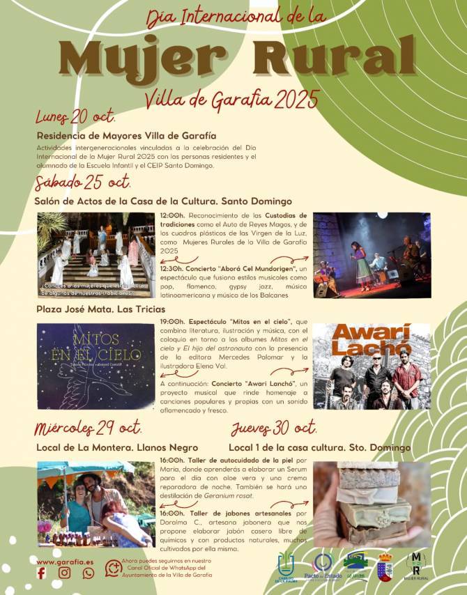 El sábado 25 de octubre, en la Casa de la Cultura de Santo Domingo, se rendirá homenaje a las Custodias de tradiciones municipales como son el Auto de Reyes Magos y los cuadros plásticos de la Virgen de la Luz, estas vecinas serán reconocidas como Mujeres Rurales de la Villa de Garafía 2025. El acto comenzará a las 12:00 horas e incluirá el concierto "Aborá Cel Mundorigen". Por la tarde, en la Plaza José Mata de Las Tricias, se ofrecerá el espectáculo "Mitos en el cielo" y el concierto del grupo "Awari Lanchó".