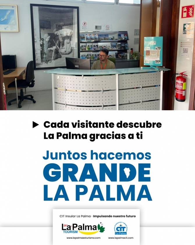 El CIT Insular La Palma presenta la campaña “Juntos hacemos grande La Palma”, una iniciativa de agradecimiento y concienciación turística que busca reconocer públicamente la labor de todas las personas que hacen posible la experiencia turística en la isla, desde informadores turísticos y guías hasta camareros, recepcionistas, restauradores, conductores, personal de limpieza, agricultores, comerciantes y tantos otros que, con su trabajo diario contribuyen a proyectar la mejor imagen de La Palma ante el mundo.