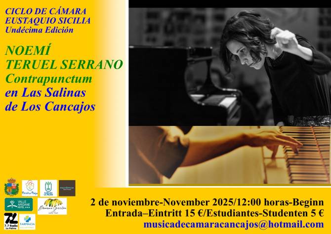 El domingo 2 de noviembre, 12 hs tendrá lugar el tercer concierto de la undécima edición del Ciclo de Cámara “Eustaquio Sicilia”, con la pianista Noemí Teruel Serrano, que volverá a participar en Las Salinas de Los Cancajos.