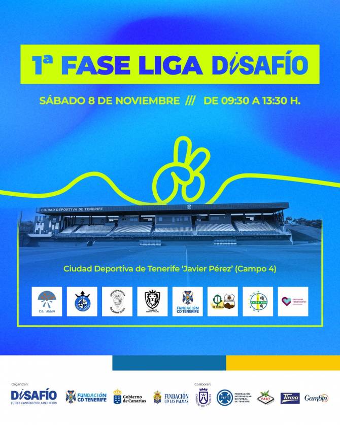 Ocho equipos participarán, mañana sábado, en la primera fase provincial de la segunda edición de la Liga DiSAFÍO-Fútbol canario por la inclusión, que tendrá como escenario la Ciudad Deportiva de Tenerife Javier Pérez. La competición promovida por el Gobierno de Canarias y desarrollada por las fundaciones del CD Tenerife y la UD Las Palmas es la primera de carácter regional dirigida a personas del archipiélago con discapacidad intelectual.