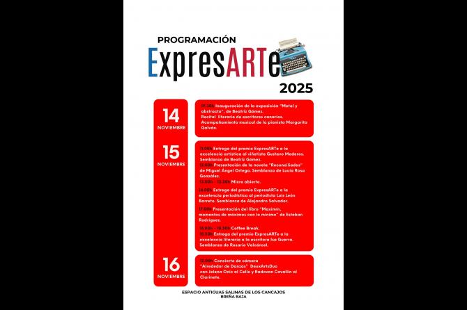 La semana del 10 al 16 de noviembre el municipio de Breña Baja acogerá las quintas jornadas literarias ExpresARTe. Un proyecto que se reubica en este municipio por la fuerte apuesta cultural que está haciendo con la firme convicción de dar a conocer el talento literario que se publica en nuestra tierra. Desde sus comienzos ExpresARTe nació con una vocación itinerante, esta será la primera edición en que se plasme este objetivo.