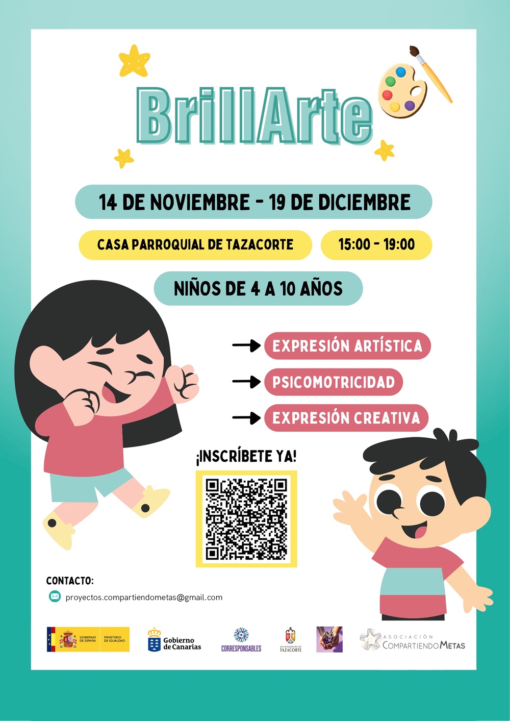 El Ayuntamiento de la Villa y Puerto de Tazacorte, a través de la Concejalía de Servicios Sociales dirigida por Lisi Sánchez, pone en marcha la actividad “Brillarte”, destinada a niños de 4 a 10 años del municipio. Esta iniciativa, que se desarrollará del 14 de noviembre al 19 de diciembre en la Casa Parroquial de Tazacorte, busca fomentar la psicomotricidad, la expresión artística y la creatividad durante el periodo escolar, ofreciendo a los pequeños un espacio de desarrollo lúdico y educativo.