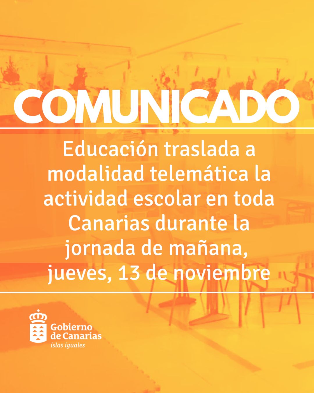 La Consejería de Educación, Formación Profesional, Actividad Física y Deportes del Gobierno de Canarias, dirigida por Poli Suárez, siguiendo las recomendaciones de la Dirección General de Emergencias y de Protección Civil, con el fin de evitar desplazamientos y prevenir incidencias ante la situación de multialerta por los episodios meteorológicos previstos para las próximas horas en el archipiélago, ha decretado la suspensión de la actividad lectiva presencial durante toda la jornada de este jueves, 13 de noviembre, en todas las islas.