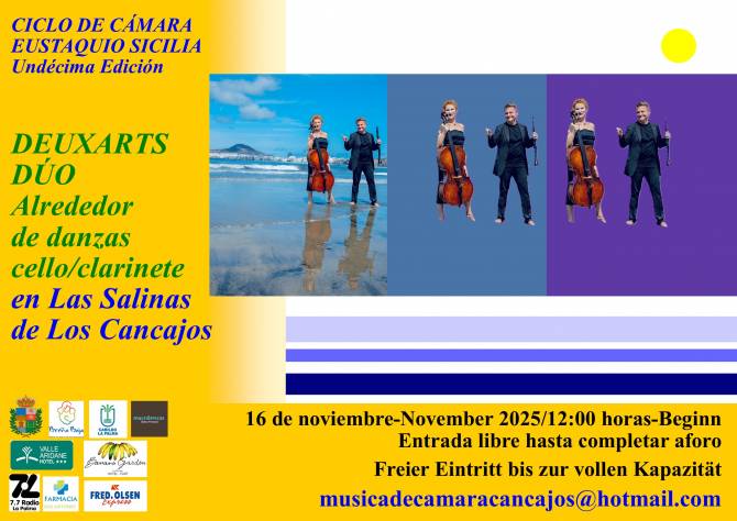 El domingo 16 de noviembre, a las 12 hs, Deuxarts Dúo nos ofrecerá un concierto titulado “Alrededor de danzas”. Cuarto concierto de la Undécima Edición del Ciclo de Cámara “Eustaquio Sicilia” en Las Antiguas Salinas de Los Cancajos.