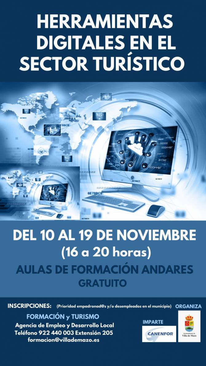 El Ayuntamiento de Villa de Mazo, a través de la Agencia de Empleo y Desarrollo Local, organiza el taller 'Herramientas digitales en el sector turístico', dirigido a profesionales y personas interesadas en actualizar sus conocimientos en el ámbito del turismo. El curso, que comenzó el pasado 10 de noviembre, se desarrollará hasta el día 19 , en horario de 16:00 a 20:00 horas, en las aulas de formación Andares.