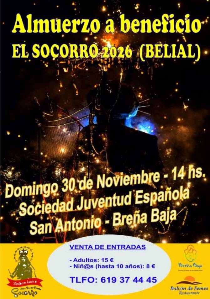 La Asociación de Vecinos de El Socorro organiza un Almuerzo a beneficio de la Fiesta en honor a Ntra. Sra. del Socorro del 2026 para el domingo 30 de noviembre en la Sociedad Juventud Española de San Antonio, a las 14.00 hs. Se cuenta con la colaboración del Ayuntamiento de Breña Baja y varias entidades comerciales.