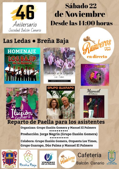 Organizan el Grupo Ilusión Gomera y Manuel El Palmero. Con la colaboración del Ayuntamiento de Breña Baja, entre otras entidades. Contara con transmisión en directo de “Rumberos FM” y habrá reparto de paella para los asistentes.