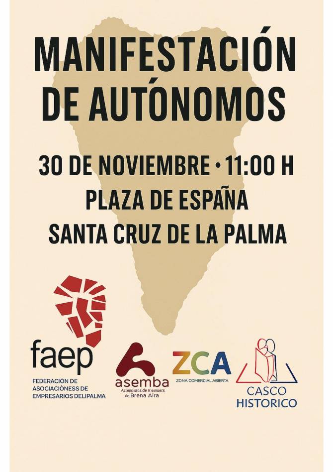 El próximo domingo 30 de noviembre hay convocada una manifestación a las 11.00h en La Plaza de España en S/C de La Palma convocada por los trabajadores autónomos Las exigencias que motivan la protesta se centran en cuatro puntos clave. En primer lugar, reclaman condiciones justas y un marco normativo que no penalice su actividad. A esto se suma una de las peticiones históricas del colectivo: la reducción de cuotas, solicitando un sistema de cotización más progresivo y adaptado a los ingresos reales de cada profesional.