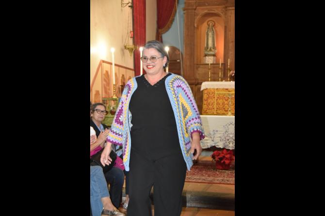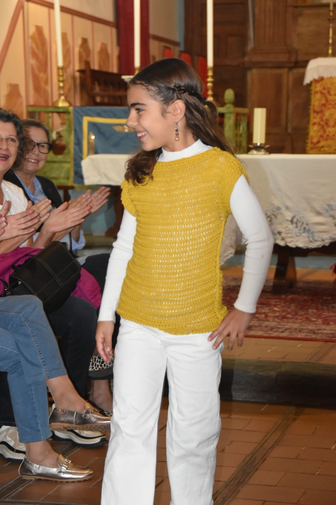 Entre velas y bancos de madera, las modelos caminaron por el pasillo central de la iglesia luciendo piezas únicas, tejidas a mano con mimo y paciencia. Cada prenda era un símbolo de creatividad y superación personal, resultado de la dedicación y el aprendizaje compartido a lo largo de los meses.