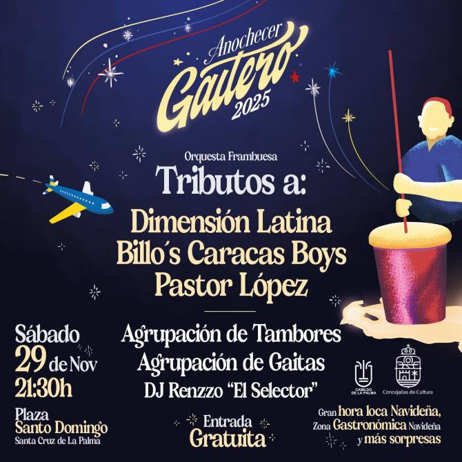 El Ayuntamiento de Santa Cruz de La Palma, a través de la concejalía de Cultura, organiza la nueva edición de 'Anochecer Gaitero 2025', que se celebrará el sábado, 29 de noviembre, a las 21:30 horas en la plaza de Santo Domingo. La entrada será gratuita para todos los asistentes.