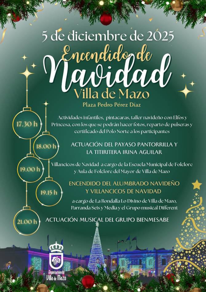 El Ayuntamiento de Villa de Mazo celebrará hoy, viernes 5 de diciembre, el encendido oficial del alumbrado navideño, un acto que marcará el inicio de la programación de Navidad. La cita tendrá lugar en la plaza Pedro Pérez Díaz con una tarde llena de actividades destinadas a familias y público de todas las edades.