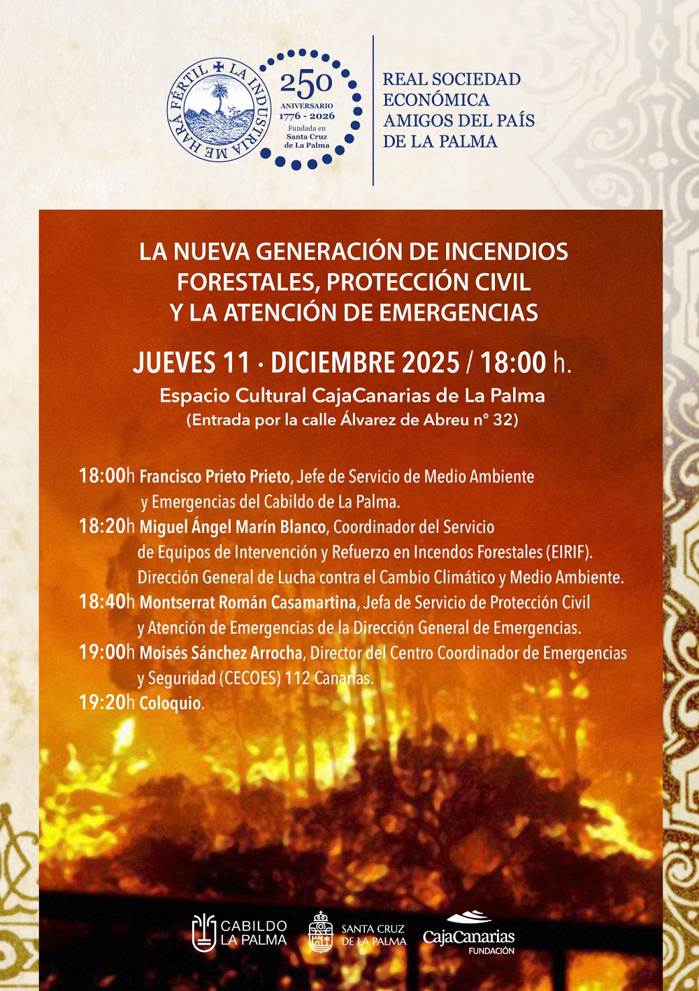 Los ponentes serán: Francisco Prieto Prieto (Jefe de Servicio de Medio Ambiente y Emergencias del Cabildo de La Palma); Miguel Ángel Marín Blanco (Coordinador del Servicio de Equipos de Intervención y Refuerzo en Incendios Forestales (EIRIF); Montserrat Román Casamartina (Jefa de Servicio de Protección Civil y Atención de Emergencias de la Dirección general de Emergencias y Moisés Sánchez Arrocha (Director del Centro Coordinador de Emergencias y Seguridad (CECOES) 112 Canarias. La Jornada concluirá con un coloquio entre los ponentes y las personas que asistan al acto.