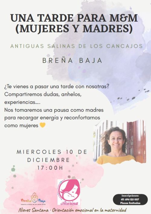 Con la importancia del autocuidado en la maternidad y en la lactancia, el Grupo de Apoyo a la Lactancia Materna “Acerina” organiza junto a Nieves Santana, y en colaboración con el Ayuntamiento de Breña Baja, una tarde para recargar energía y reconfortarnos como mujeres, el miércoles 10 de diciembre, a partir de las 17 h, en las Antiguas Salinas de Los Cancajos.
