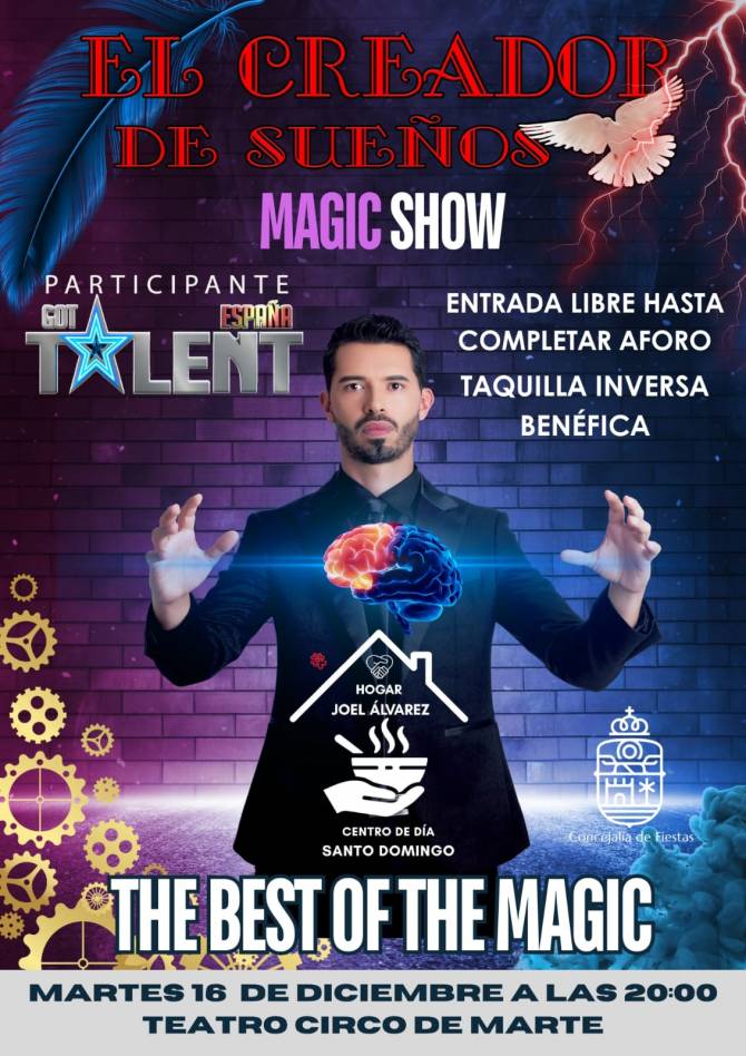 El Ayuntamiento de Santa Cruz de La Palma, a través de la Concejalía de Fiestas y Movimiento Vecinal, anuncia la celebración del espectáculo de magia 'El Creador de Sueños – Magic Show', que tendrá lugar el martes, 16 de diciembre, a las 20:00 horas, en el Teatro Circo de Marte.