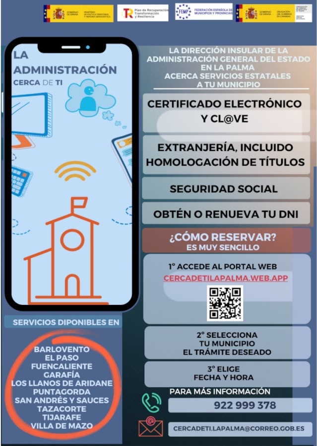 Con este programa, que opera una descentralización administrativa dentro de la misma isla para algunos trámites con el Estado, colaboran los municipios de Barlovento, El Paso, Fuencaliente, Garafía, Los Llanos de Aridane, Puntagorda, San Andrés y Sauces, Tazacorte, Tijarafe y Villa de Mazo, cuyas vecinas y vecinos pueden beneficiarse del beneficio que comporta el plan La Administración cerca de ti.