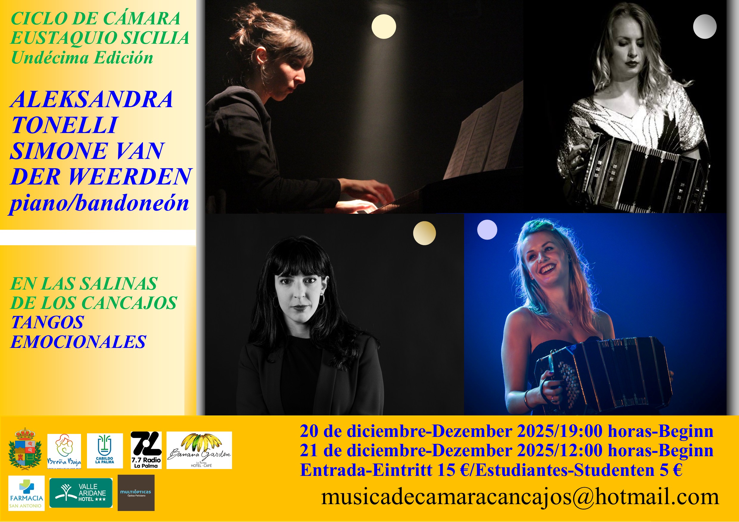 Los días, 20 y 21 de diciembre tendremos el séptimo concierto de la undécima edición del Ciclo de Cámara “Eustaquio Sicilia” en las Antiguas Salinas de Los Cancajos con la actuación de Aleksandra Tonelli y Simone Van der Weerden, quenos ofrecerán un repertorio dedicado a los Tangos Emocionales. Tangos fusionados con el jazz.