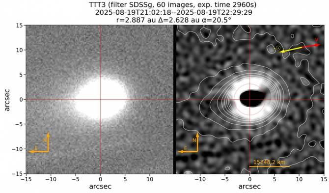 El Two-meter Twin Telescope (TTT) ha realizado un hallazgo pionero en la astronomía: la primera detección de un chorro de gas y polvo (o jet) y su modulación periódica en un cometa de origen interestelar, el 3I/ATLAS.