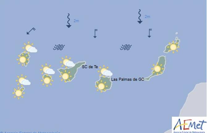 El viento soplará del Nordeste, más intenso en puntas Noroeste y Sureste, girando gradualmente durante la mañana a Norte y posteriormente a Noroeste; esperándose intensificación del viento en la costa Este, en horas centrales, y en la Nordeste al final, mientras que en la punta Noroeste se mantendrá intenso todo el período.