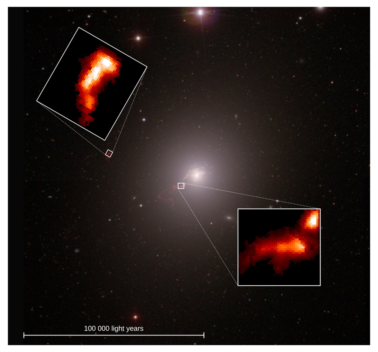 Más lejos, la imagen cambia por completo. El filamento exterior separado se mueve de forma más estable y uniforme, y su presencia parece estar relacionada con un chorro anterior de un periodo de actividad pasado. La composición del gas dentro de estos filamentos también varía. Más cerca del centro, se ve afectado por el agujero negro y sus chorros activos, y muestra signos químicos diferentes a los del gas más alejado. Sin embargo, incluso el filamento distante muestra una composición inesperada para una zona tan tranquila, lo que sugiere que puede haber procesos subyacentes en marcha que aún no se comprenden del todo.