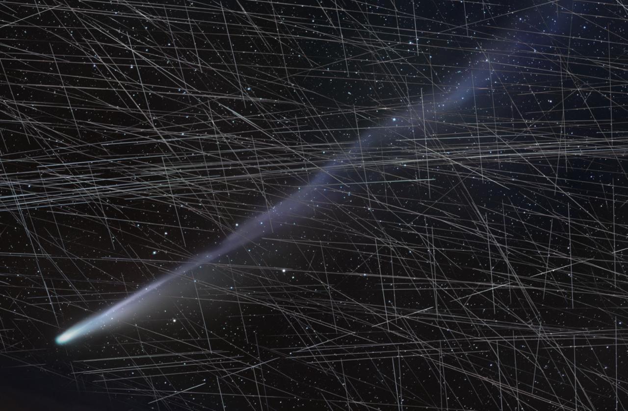 Este viajero espacial, una roca de hielo y polvo de apenas un kilómetro de diámetro, desplegó una cola de más de 30 millones de kilómetros, superando en 20 veces el tamaño de nuestro Sol. Sin embargo, la fotografía revela otra realidad: una maraña de más de un millar de trazas luminosas pertenecientes a los más de 13.000 satélites que orbitan la Tierra se superponen al cometa.