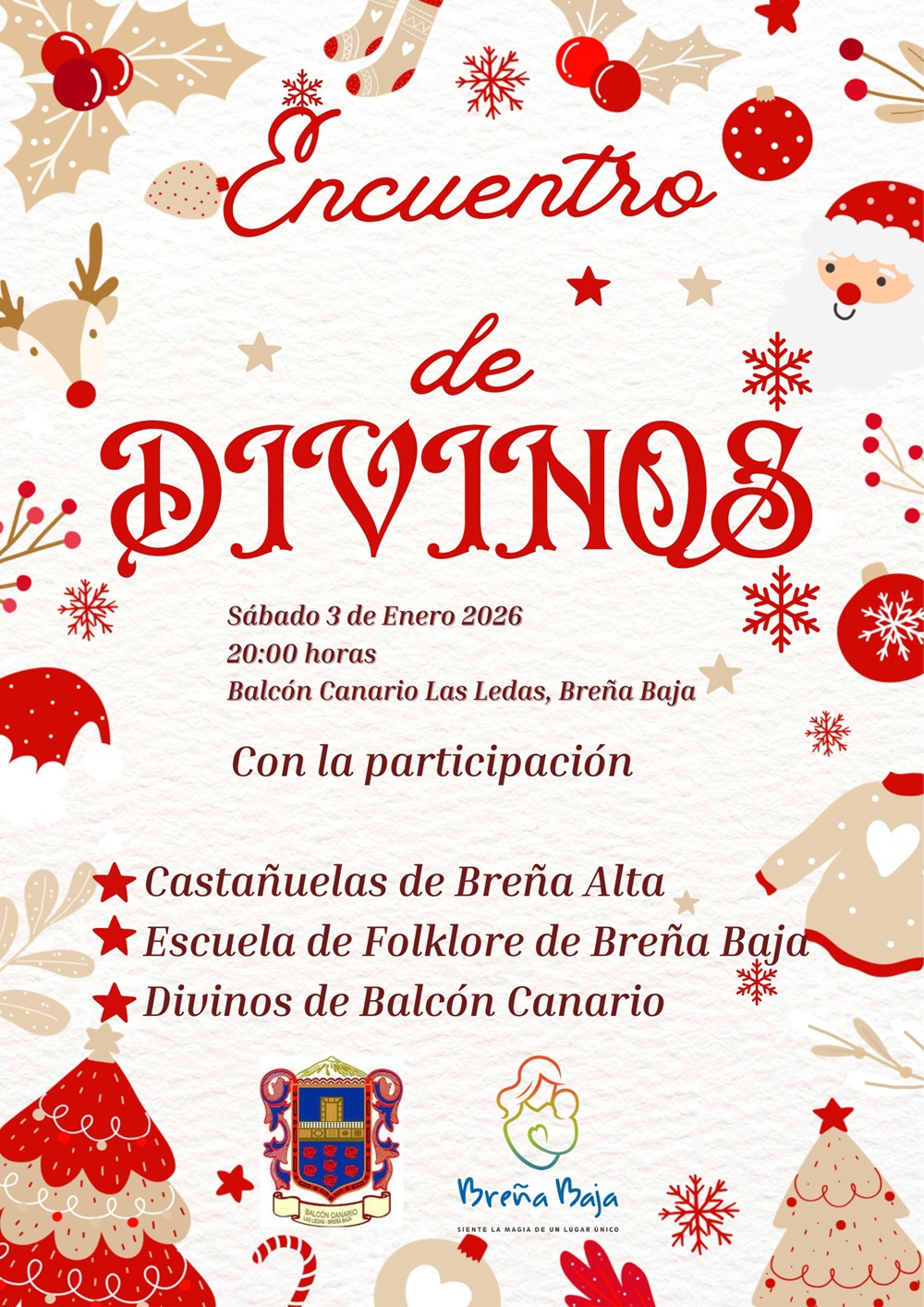 La Sociedad “Balcón Canario” de Las Ledas organiza un Encuentro de Divinos el sábado 3 de enero a las 20.00 hs. En el marco del programa de Navidad de Breña Baja, que viene organizando el Ayuntamiento de Breña Baja.
