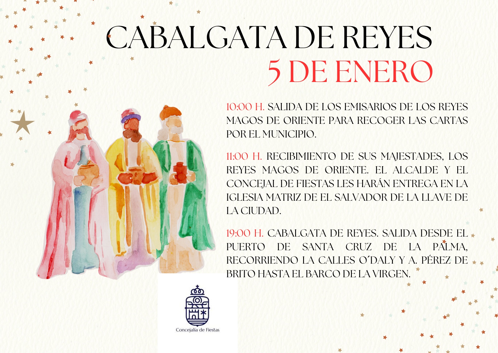 El Ayuntamiento de Santa Cruz de La Palma presenta los actos previstos para el próximo 5 de enero, una de las fechas más esperadas por los niños y niñas del municipio, marcada por la llegada de Sus Majestades los Reyes Magos de Oriente y la celebración de una de las cabalgatas más antiguas de Canarias.