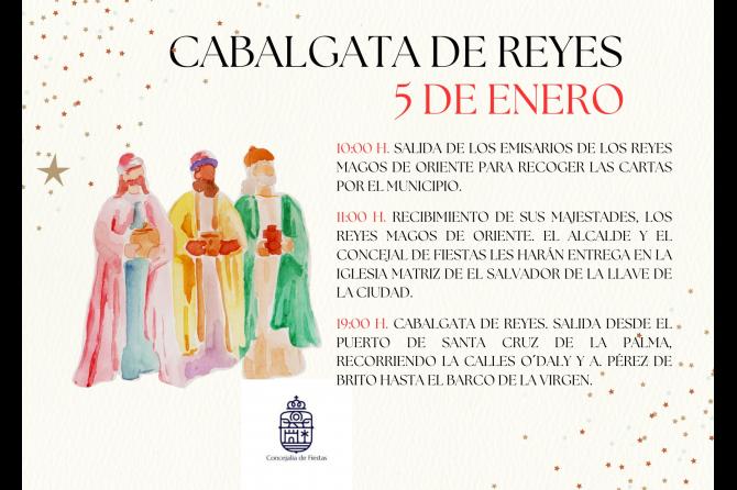 La programación culminará a las 19:00 horas con la 109ª edición de la Cabalgata de Reyes, que partirá desde el Puerto de Santa Cruz de La Palma hasta la avenida de Las Nieves. El desfile contará con carrozas, comitivas reales y numerosos participantes, consolidándose como una de las cabalgatas más antiguas del archipiélago. Se habilitará un tramo sin ruido en el inicio del recorrido, entre la zona portuaria y el comienzo de la calle Real, con el objeto de adaptar este desfile para menores y personas adultas con patologías asociadas al trastorno del espectro autista.