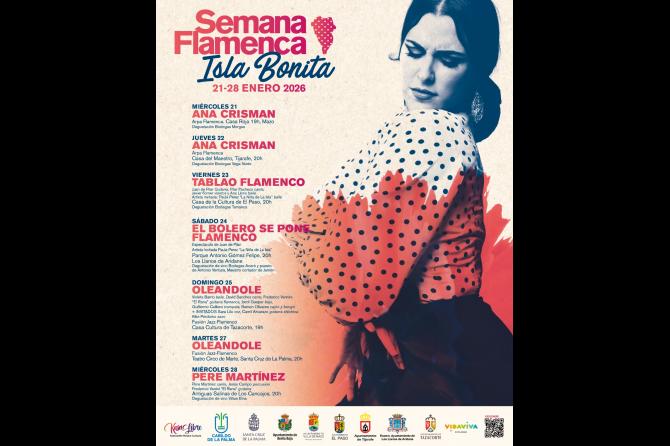Al día siguiente, el 24 de enero a las 20h en el Parque Antonio Gómez Felipe en Los Llanos de Aridane se realizará el espectáculo “El bolero se pone flamenco”, dirigido por el guitarrista valenciano Juan de Pilar. El grupo OleándOle, que fusiona flamenco y jazz desde su concepto de flamenco simbiótico, actuará el 25 de enero a las 19h en la Casa de la Cultura de Tazacorte y el 27 de enero a las 20h en el Teatro Circo de Marte en Santa Cruz de La Palma.