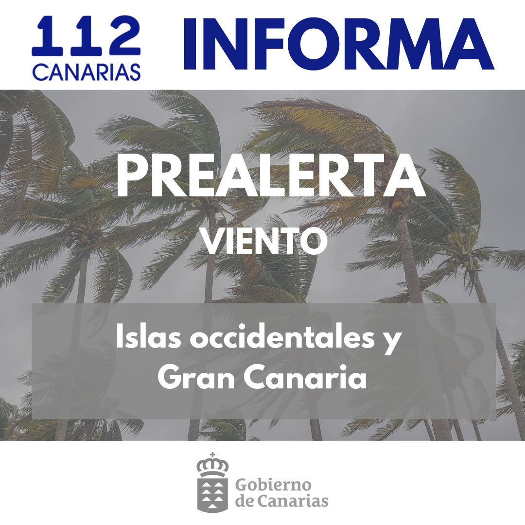 El Gobierno de Canarias, a través de la Dirección General de Emergencias, declara la situación de prealerta por viento en las islas occidentales y Gran Canaria a partir de las 18:00 horas de hoy, viernes 23 de enero. Esta decisión se toma teniendo en cuenta la información facilitada por la Agencia Estatal de Meteorología y otras fuentes disponibles, y en aplicación del Plan Específico de Emergencias de Canarias por Riesgos de Fenómenos Meteorológicos Adversos (PEFMA).