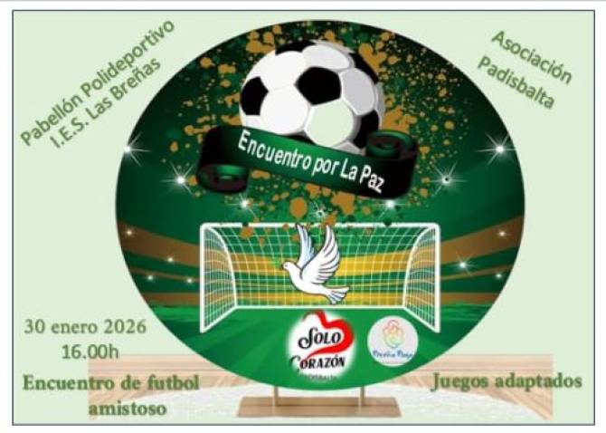 Con el lema “No hay camino para la paz, la paz es el camino” (Gandhi), la Asociación Padisbalta celebra un Encuentro por La Paz, el viernes 30 de enero a las 16 hs en el pabellón del I.E.S. “Las Breñas” en San José. Colabora el Ayuntamiento de Breña Baja y esta abierto a todas las personas que quieran participar de esta actividad, “Voluntari@s de Corazón”.