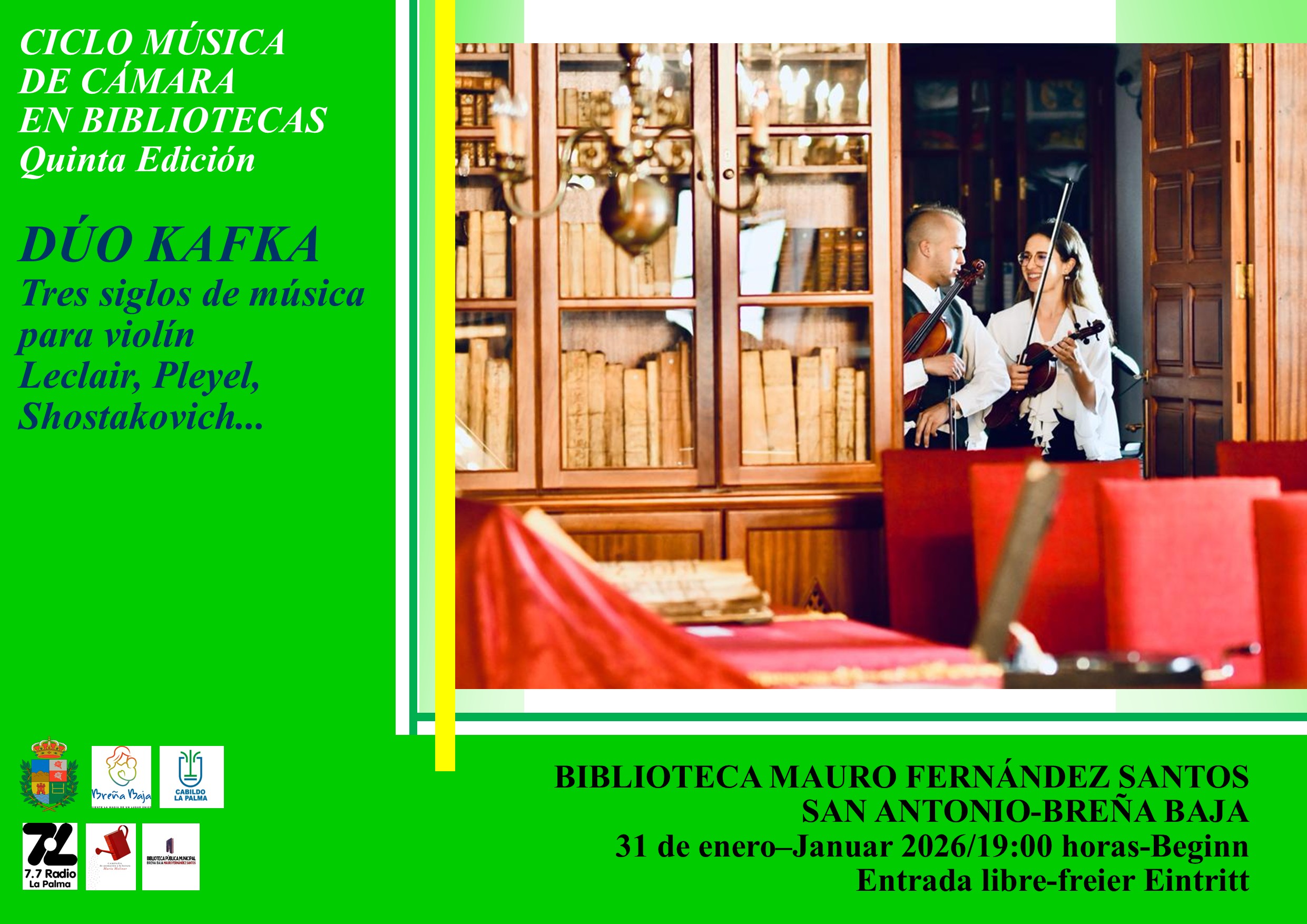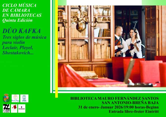 El sábado 31 de enero a las 19 has en la Biblioteca Municipal “Mauro Fernández Santos” de San Antonio tendrá lugar un Concierto “Tres siglos de música para violín” a cargo del DÚO KAFKA, correspondiente a la quinta edición del Ciclo de Música de Cámara en Bibliotecas. Entrada libre hasta completar aforo.