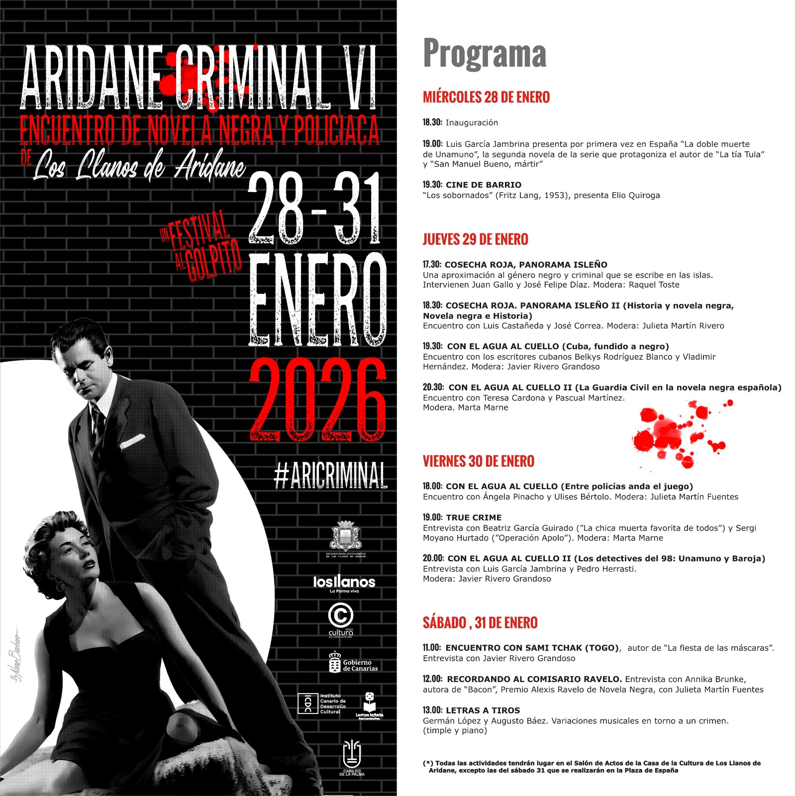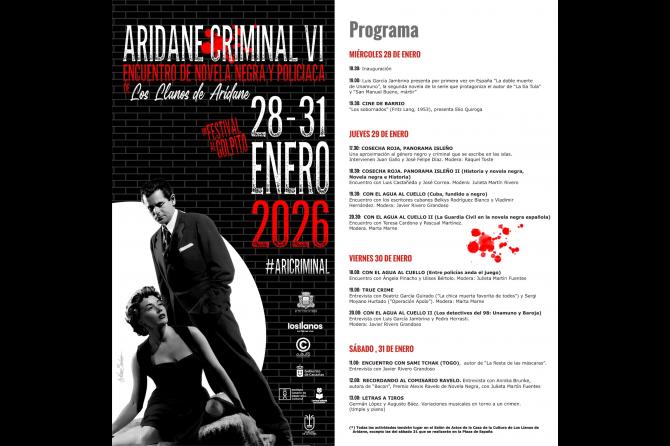 Los Llanos de Aridane acoge la sexta edición de Aridane Criminal, un festival enfocado a la novela negra y policiaca que reúne entre el 28 y el 31 de enero a más de 17 escritores de este género literario y que incluye un amplio programa con charlas, mesas redondas y la proyección de distintos metrajes temáticos.