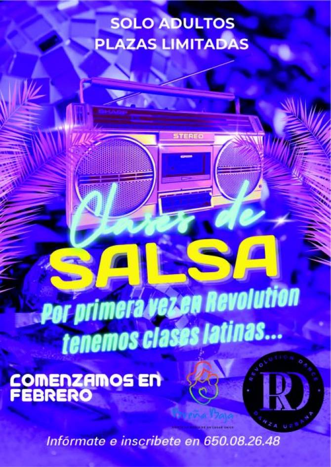 A partir del mes de febrero comienzan las clases de Salsa para adultos en Revolution Dance. Ubicado en San José (C/ Feliz Duarte). Con la colaboración del Ayuntamiento de Breña Baja.