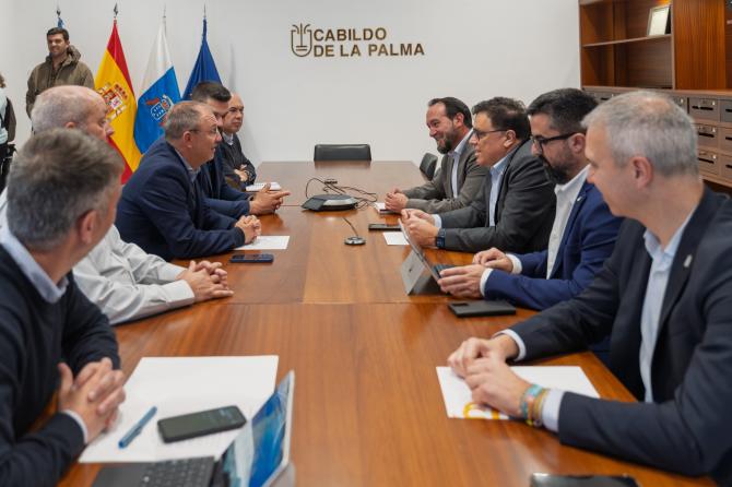 El consejero de Política Territorial, Cohesión Territorial y Aguas del Gobierno de Canarias, Manuel Miranda, y el presidente del Cabildo de La Palma, Sergio Rodríguez, mantuvieron hoy una reunión de trabajo en la que se abordaron cuestiones clave en materia de aguas, emergencias y ordenación del territorio, con el objetivo de reforzar la cooperación institucional y avanzar en actuaciones prioritarias para la isla.